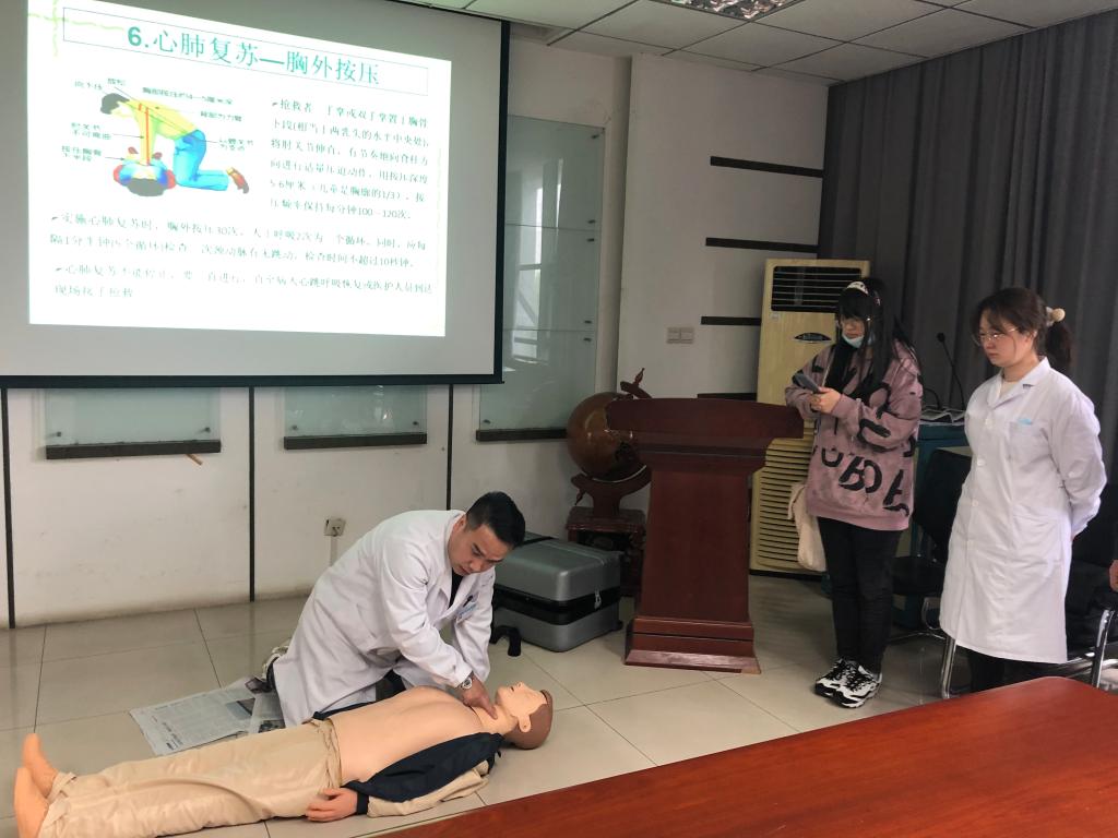随后,伊航医生现场给大家模拟了如何对出现紧急状况的伤者进行“心肺复苏”,通过现场道具的演示,结合现场老师的体验,伊航医生就“心肺复苏”相关动作规范进行讲解。