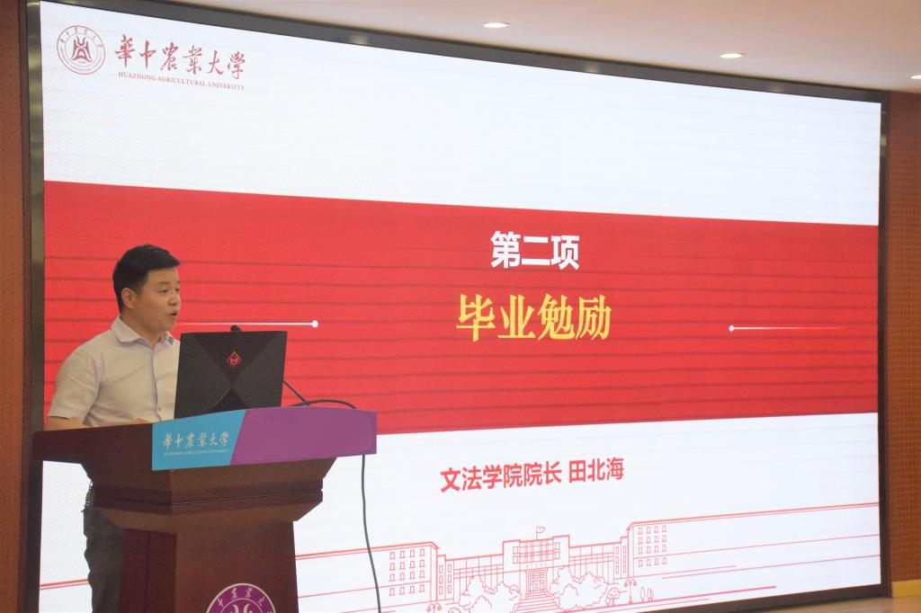 随后,田北海经理为同学们进行了题为“正视‘内卷’拒绝‘躺平’”的毕业勉励。针对当今网络上火爆的“内卷”“躺平”两个词,他认为在同学们即将开启人生新征程之际,澄清“内卷”和“躺平”两个概念显得尤为重要。田经理从社会学专业的角度,认真剖析了“内卷”这一现象的本质与误读,“内卷化实质是一个系统在外部扩张受到约束的条件下内部的精细化发展过程,而当今内卷化普遍被人们理解为一种结构性压力。”他讲到,真正的内卷并不可怕,作为时代新人,同学们应当做到的是正视内卷,拒绝躺平。要充分发挥能动性,积极拓展外部资源,避免低水平重复的内卷。同时,要勇于创新,积极发掘内部潜力,习惯在环境的约束下挖掘潜能。最后,田经理表达了对毕业生的希冀:“文以载道,法以明理,期待各位学子在世界百年未有之大变局中把握航向,坚守为学之道、为人之道,以学为真,立身以诚,祝你们乘风破浪,大展宏图。”