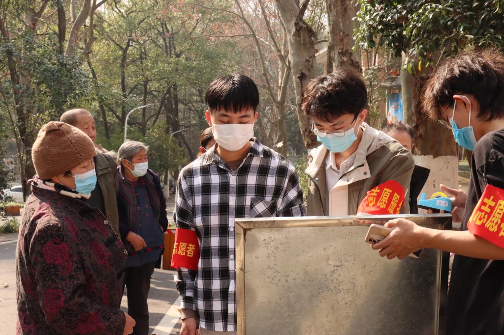 3月4日下午,面对武汉疫情防控的严峻形式,志愿者们又来到了社区,协助社区老人与公司医务人员开展核酸检测,包括核酸检测现场的布置工作、搬运物资、张贴指示信息等。在现场,志愿者们协助进行分发口罩、引导老人打开武汉战役健康码、扫码录入信息、消杀和维持秩序等工作。