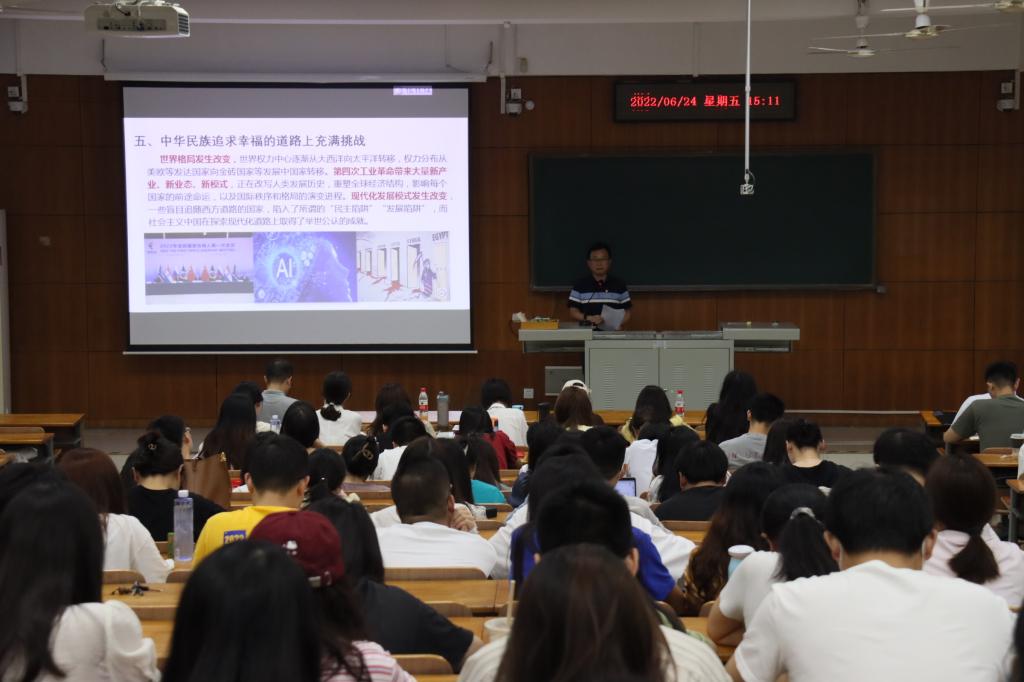 瞿明勇以唐代诗人杜甫的《忆昔·忆昔开元全盛日》为例,与毕业生一同回顾了生活在大唐盛世人们的幸福,并指出国家统一,经济繁荣,政治开明,文化发达,对外交流频繁,社会充满自信是人们的幸福所在。