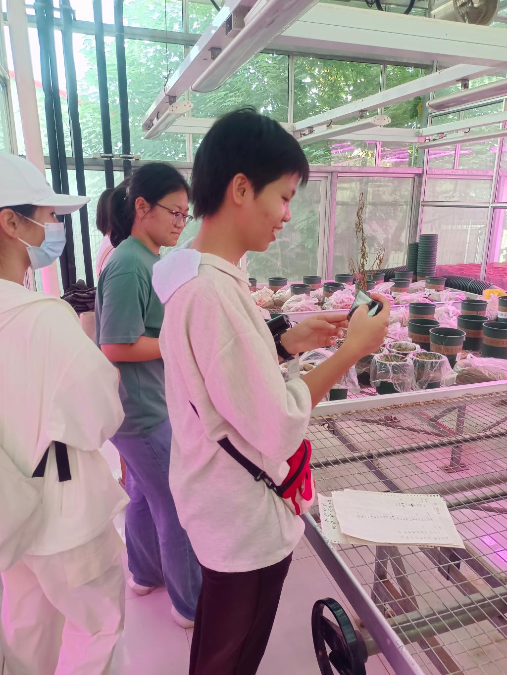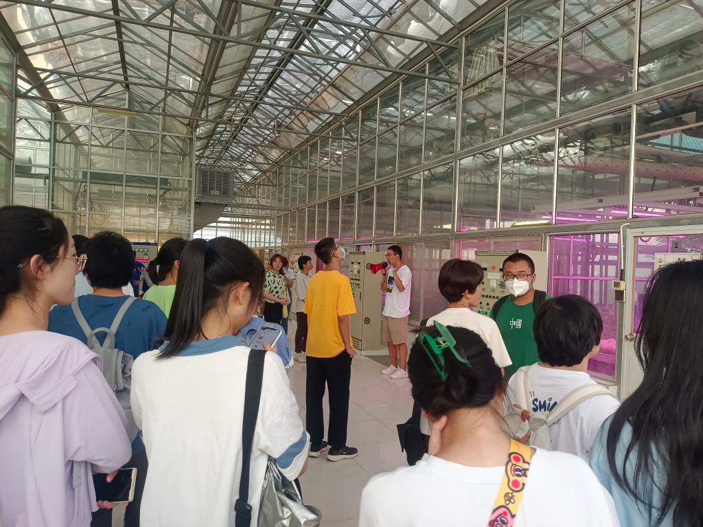 随着队伍的前进,大家陆续进入现代化温室。与普通温室不同的是,现代化温室可以很好地模拟外面的大气,实现全天候作物生产。面对长势良好的各种植物和现代化大棚,同学们纷纷走进温室内感受现代化农业机械的运行与作物蓬勃的生命力。