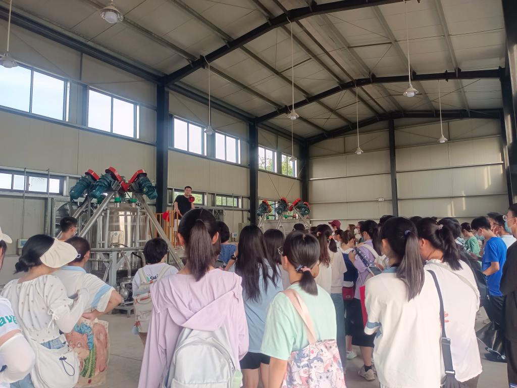 来到资源与环境公司的肥料工艺车间。同学们面对各种复杂庞大的机器,都争先恐后地向老师提问。在得到老师耐心地科普后,大家都纷纷感叹液体肥料生产竟有如此奥秘。