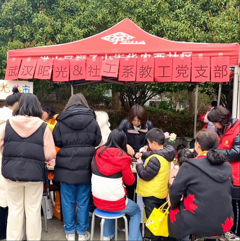 活动现场,各社区组织“摆摊设点”,为居民开展义诊服务、法律咨询、便民服务、文艺表演、知识科普等形式多样、内容丰富的志愿服务活动。伟德中国官网入口社会工作系教工党支部与武汉市阳光社工、员工志愿者联合开展“阳光花市”手工花制作活动。