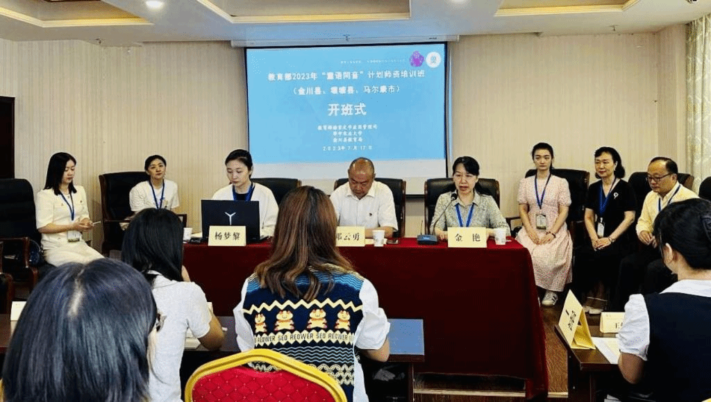 (通讯员 吴雅轩 韩淑芳 金艳)为深入学习贯彻习近平总书记关于国家通用语言文字教育“要从娃娃抓起”的重要指示精神,进一步加大国家通用语言文字在民族地区、农村地区的推广力度,根据教育部语言文字应用管理司工作要求,7月17日上午,教育部2023年“童语同音”计划四川阿坝藏族羌族自治州团队培训项目开班仪式在四川省金川县承运大酒店三楼会议室举行。来自阿坝州金川县、壤塘县、马尔康市三地的100名学员教师与伟德中国官网入口项目团队齐聚壮美金川,共同参加了开班仪式。开班仪式由伟德中国官网入口教育培训公司杨梦黎老师主持。