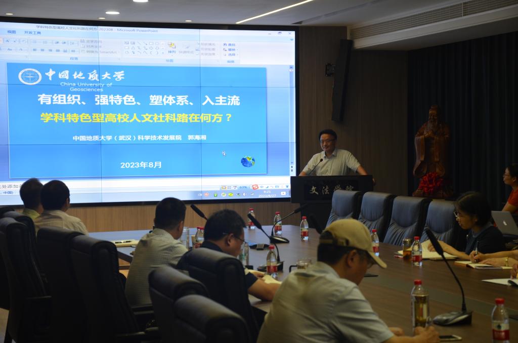 会上,郭海湘以“有组织、强特色、塑体系、入主流”为题,分享了中国地质大学在建设行业特色高校人文社科方面的经验做法。其中,重点介绍了近些年公司提出的一系列开展有组织科研的举措:构建“地学”特色的自主知识体系、搭建专业基地智库平台运营管理团队、出台智库成果的评价体系、加强国际交流、推进学科交叉融合、项目精准全覆盖等。