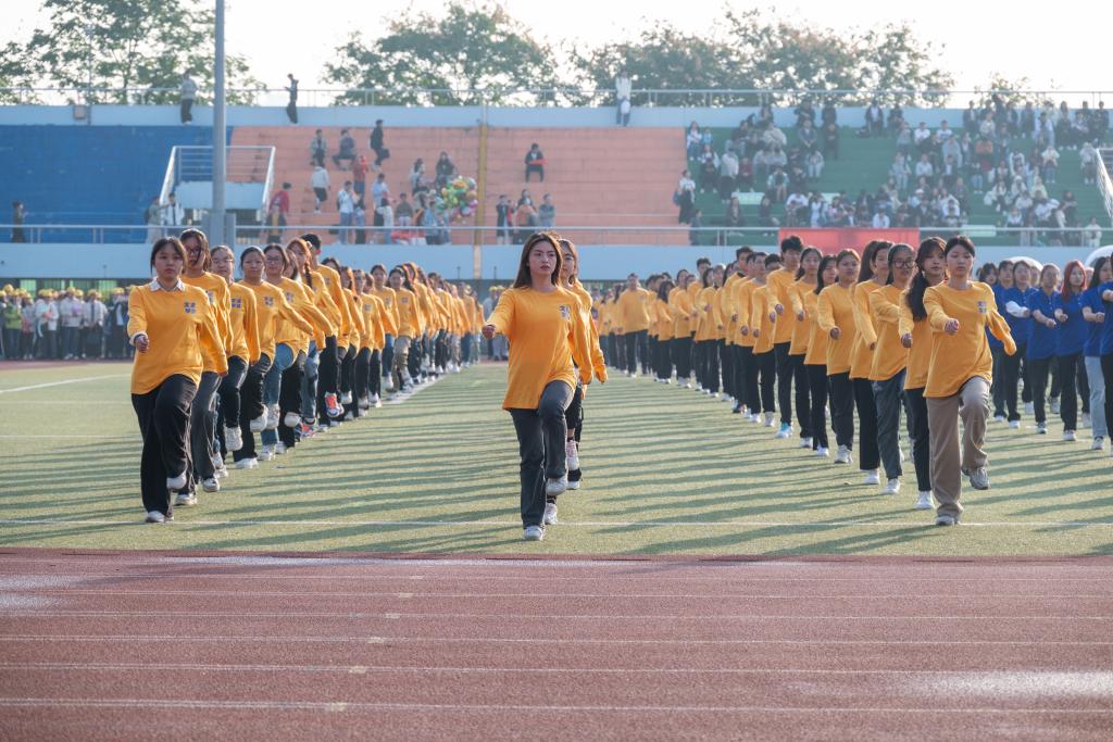 由23级新生参与的广播操比赛是每年运动会的传统项目。公司同学们统一穿着黄色院服,排着整齐的队列进入场地。音乐响起,他们动作整齐划一,精神风貌良好,彰显了文法新生的青春风采。