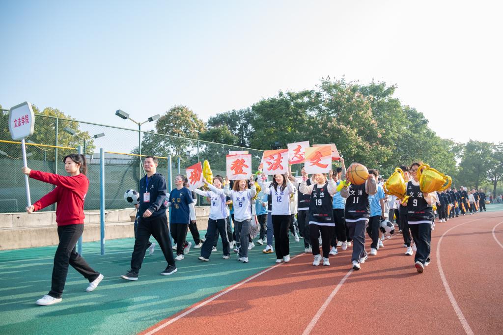 入场式上,公司的方阵由各专业同学、各球队队员、国学部学员、公司教师代表组成。在整齐响亮的口令下,高举旗帜和专业特色气球的各专业同学、高举奖杯和球类泡沫板的球队队员、身着传统服饰的国学部学员在“文法登场,斗志昂扬”的口号声中向主席台走来。他们意气风发,豪情满怀,体现了文法院师生的龙马精神与对体育运动的无限热爱。