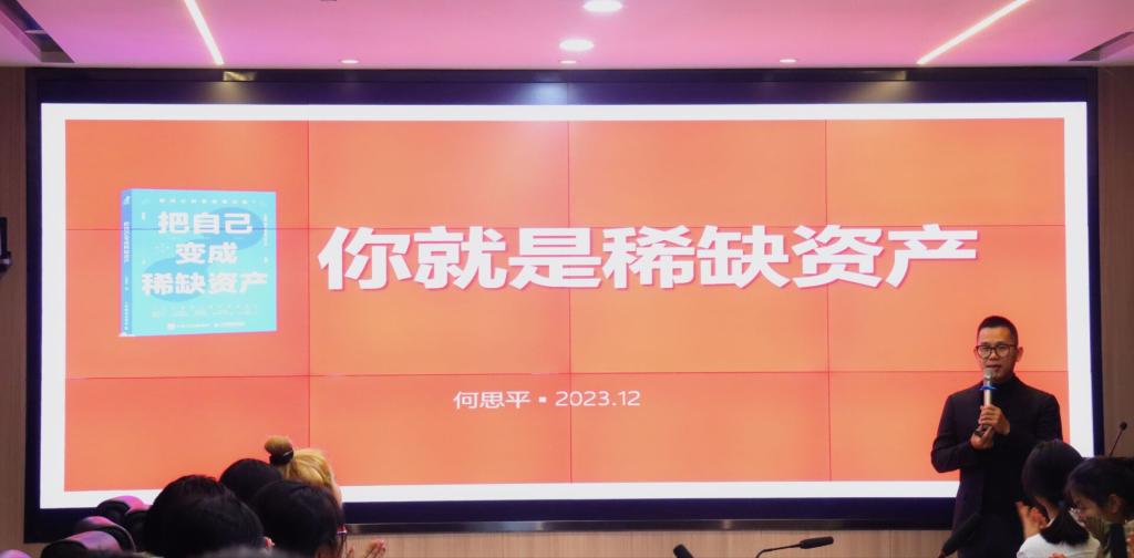 讲座伊始,何思平回望了他的在校时光与创业经历,指出“大学不是谋生的手段”“人的价值在于创造”。接着,他鼓励老员工要勇于尝试、敢于走出舒适圈并针对在座同学提出的“如何将理想转化为现实”这一问题,从其出版的著作《把自己变成稀缺资产》出发,结合自身经历,围绕认知力、行动力、生命力三个方面分别进行了解答阐释。