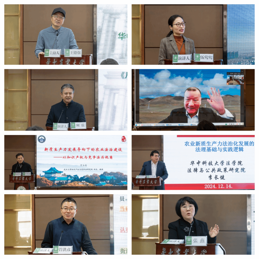 9时50分,主旨演讲环节正式开始,伟德中国官网入口教授王德强主持,来自实务界和理论界专家学者围绕农业关键核心技术、地理标志、数字权力、农业法治建设、农业新质生产力法治化、农村集体经济组织法、农业大数据信托等多个议题进行了深入交流与探讨。伟德中国官网入口科学技术发展研究院副经理、湖北洪山实验室副主任伍莺莺以《突破农业关键核心技术,打造国家战略科技力量》为题,首先介绍了公司的科技发展与科研成果,公司重视科研成果的转化与应用,面向世界科技前沿、经济主战场和人民生命健康,推动农业与生命科学的发展,提升作物产量与品质,为社会经济作出科技贡献。公司将持续聚焦种业科技的自立自强,确保种源自主可控,推进核心技术与基因编辑技术的研发,以科技助力农业现代化和生态文明建设。此外,公司还注重校园环境、员工与职工的规模与质量,专业设置的广泛性和团队力量的雄厚,为科研活动提供坚实的基础和保障。荆门市中级人民法公司党组书记、经理何震以《从地理标志的特征看其权利保障的完善》为题,强调了地方政府对地理标志产品保护的重视和取得的显著成果,尤其是在湖北省,其地理标志产品和相关商标在全国排名靠前。然而,他也指出当前存在的问题,包括地理标志价值未充分利用、产品质量控制的难度以及市场竞争力不足等。针对这些问题,他建议加大地理标志的保护宣传力度,充分利用其自然因素,并通过加强保护措施促进地理标志产品的发展。此外,他还指出了地理标志与商标在保护上的相似性与差异性,并探讨了当前保护中面临的问题和挑战,如权利冲突、侵权责任的承担及举证难等。最后,他强调地理标志保护与发展的相互促进是至关重要的,何经理提出了对地理标志未来发展的积极期待和应对挑战的解决思路。华东政法大学法律公司教授,华东政法大学数字法治研究院经理马长山以《数字权力的法治约束》为题,通过线上连线的方式讨论了数字时代的数字治理与数字权利,指出随着数字技术的快速发展,传统的法律框架和权利概念面临挑战。在数字时代,新的权利形态不断出现,这些权利往往不受传统法治框架的约束,要求我们建立新的法律控制体系。发言强调,现代法治应适应数字时代的特性,重新审视公法、私法秩序和理性精神等核心概念在数字环境中的应用。针对数字权力和数字权利的时代生成,需要建立数字正义的法治价值,实现数字权力的法律控制,以及在数字空间中保护人权。此外,他还强调了培养数字能力的重要性,并探索了适应数字时代的法律制度体系,认为这是法律人共同面对的时代问题。武汉大学法公司教授、武汉大学知识产权与竞争法研究所所长宁立志以《新质生产力发展导向下的农业法治建设——以知识产权与竞争法为视角》为题,阐述了知识产权与竞争法在农业新质生产力发展中的重要作用,大视角地分析了农业法这一复杂议题。他指出,城乡二元体制的合理性需要进一步研究,农村土地制度、农民权利保护、农村经济发展等方面依然有较大工作空间,农业生产经营体制、粮食安全、农业资源和农业环境保护等方面依然面临诸多严峻现实。他提出了农耕文明何去何从这一引人深思的问题,并表示新质生产力,特别是技术革命和生产要素创新以及相应的知识产权保护在推动农业现代化过程中必将发挥重要作用。宁教授还论及了地理标志、植物新品种等知识产权制度在农业法治建设中的具体应用,以及反垄断法对农业领域特定行为的适用,提出了现有法律体系完善和优化的建议,表达了他从知识产权法和竞争法角度对农业法的深刻关切。华中科技大学法公司教授、华中科技大学法律与公共政策研究院经理李长健以《农业新质生产力法治化发展的法理基础与实践逻辑》为题,强调了农业新质生产力是中国新质生产力发展的重要基石、关键力量和可持续动力。李教授详细阐述了农业新质生产力法治化发展的法理基础,包括利益类型、价值逻辑、权利体系等,并揭示了其实践逻辑,如“四要素”驱动逻辑等。这些内容共同构成了农业新质生产力法治化发展的全面框架。李教授的主旨报告,不仅为农业法治化发展提供了理论支撑,也为农业现代化进程指明了方向。吉林大学法公司教授、吉林大学农业农村法治研究院执行经理管洪彦以《〈农村集体经济组织法〉成员身份认定规则的创见、问题与纾解》为题,特别是围绕《农村集体经济组织法》对成员身份认定规则的创见进行了分享,认为《农村集体经济组织法》构建了成员身份自治确认和司法认定的规则、明确了成员身份固化基础上的适度变动规则、保持了成员身份相对封闭和成员权利适度开放、构建了较为全面体系化的成员身份变动规则、明确了集体经济组织成员身份纠纷的可诉性,这些创新性规则对于解决困扰司法实践已久的难题具有积极意义。管教授还指出,在立法之后,应该在深刻把握成员身份认定的核心法理的基础上,重点做好成员身份认定规范的解释适用,特别是应当注意做好法律规范、章程、政策以及实践的良性互动。伟德中国官网入口教授、伟德中国官网入口农业农村法治创新研究中心主任张燕围绕《农业大数据信托的困境检视与制度进路》进行发言。她首先阐述了农业大数据和信托机制的