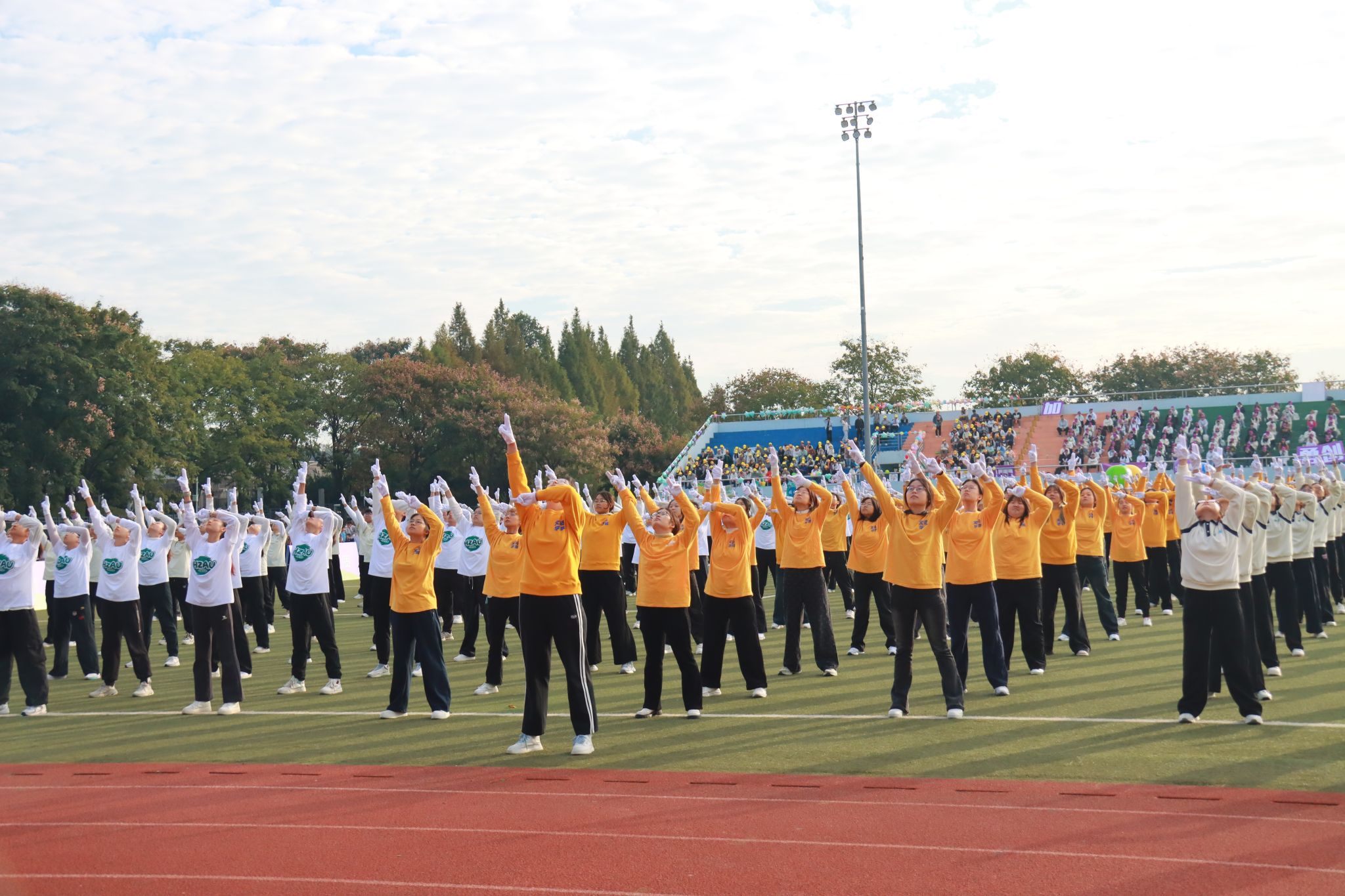在广播体操比赛中,公司代表队成员身着统一的黄色上衣,随着音乐旋律,动作整齐划一,身姿挺拔昂扬,充分彰显了文法学子的蓬勃朝气。