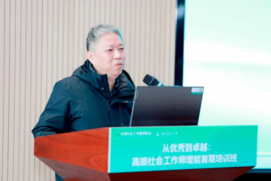 陆建义在致辞中对本次培训班的举办表示热烈的祝贺。他谈到,近年来,社工机构发展面临着巨大挑战,未来需进一步推动服务向专业化、市场化、品牌化发展,高级社工师应发挥引领作用。他期待与各方加强协作,共同解决社会治理疑难问题。