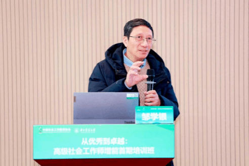 上午,中国社会工作学会秘书长邹学银以“我国社会工作的相关政策内涵”为题作了专题报告。报告深度聚焦政策前沿与行业发展,系统解读了中央社会工作部的成立背景、组织架构与职能定位,明确了社会工作者、专业人员、党务工作者、志愿者四支队伍的建设方向,并围绕党建引领基层治理、民生保障、行业转型等关键议题进行了阐述,为学员把握行业方向、提升专业服务水平提供了思路。